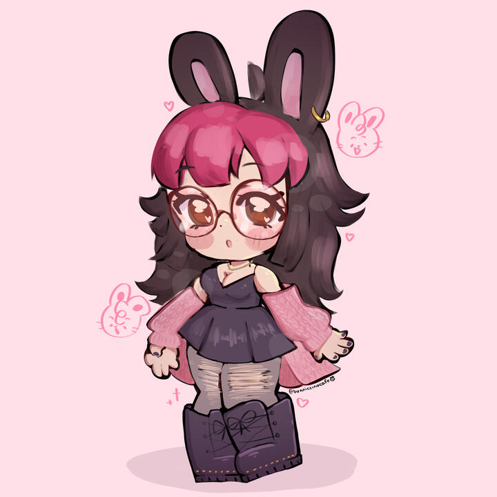 i love to create art! i specialize in chibi artstyles.when i was in 3rd grade, i used to trace the pokemon books i would buy at book fairs. this got me into watching anime, and because of that, i gathered lots of art-style inspiration from anime.i always loved art as a hobby, but never thought to turn it into a career. i went to college and got my degree in computer science with a minor in mathematics, then got a job in my field.i still loved doing art so much during college that i started Bunniccino Cafe. i took commissions and attended local artist alleys until covid hit.i took a halt to my business to, and as of 2023 i slowly started to get back to my business. i started to sell on Etsy and take commissions again.in 2024 i had to put it all on pause (again) because of some major life events. i got married to my best friend, and we bought a house together. now i have my own art space so i can freely do cosplay and art again without the space limitations i had previously.aside from art, i enjoy spending my time playing video games, making clothes, cooking, and baking. i'm really into hero shooter games and enjoy playing them competitively. i currently play marvel rivals, floating around GM. my mains are magneto, thor, and hela. (i mostly play vanguards)